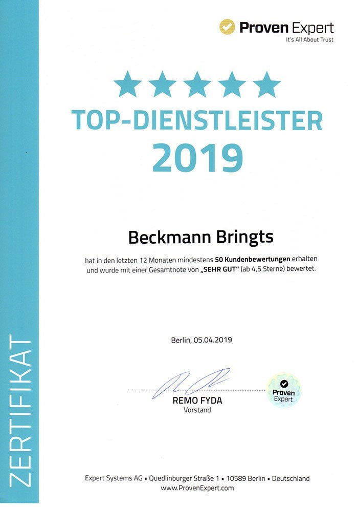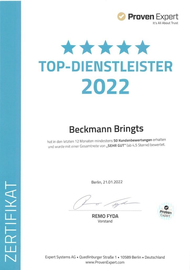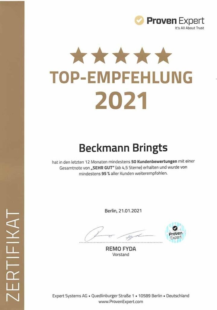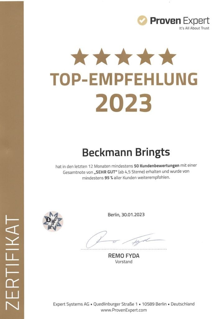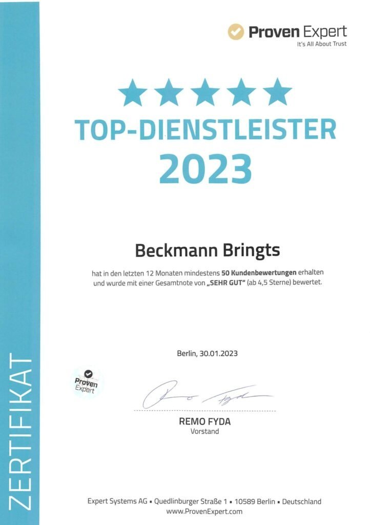 Seit 2018 wird Beckmann bringt’s regelmäßig als Top-Dienstleister und Top-Empfehlung ausgezeichnet. Mehr als 2.000 Kundenbewertungen bestätigen unsere Zuverlässigkeit, Frische und unseren Service.