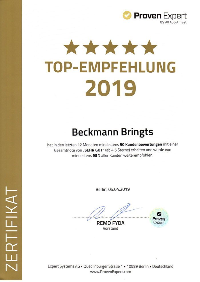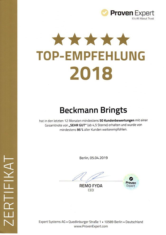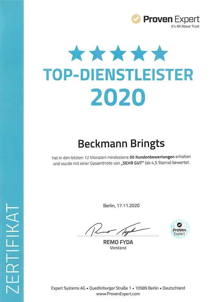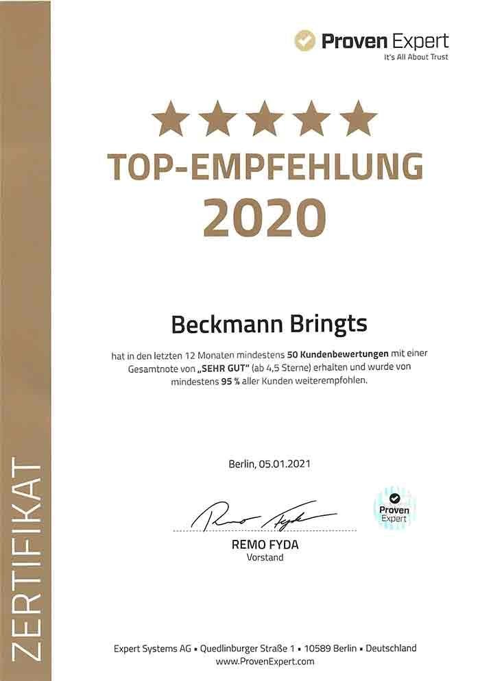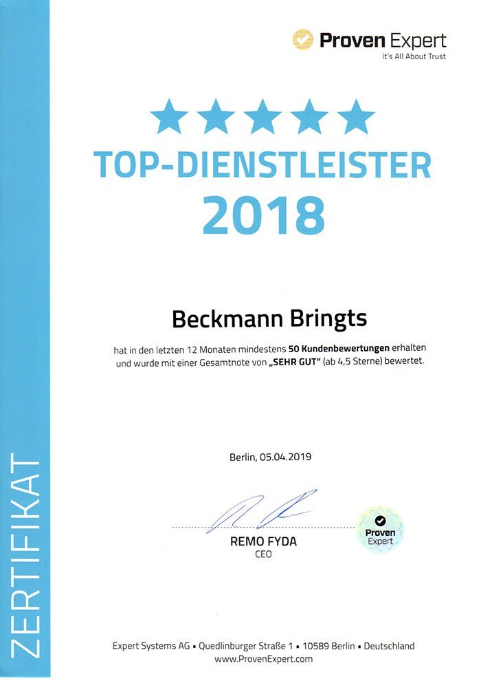 Seit 2018 wird Beckmann bringt’s regelmäßig als Top-Dienstleister und Top-Empfehlung ausgezeichnet. Mehr als 2.000 Kundenbewertungen bestätigen unsere Zuverlässigkeit, Frische und unseren Service.